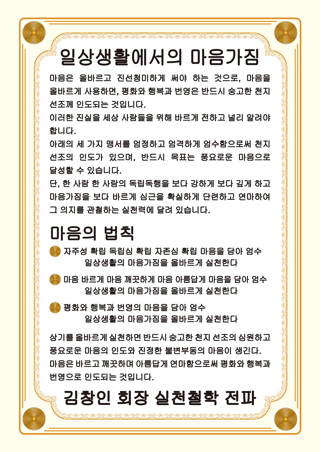 마음은 바르고 깨끗하며 아름답게 연마함으로써 평화와 행복과